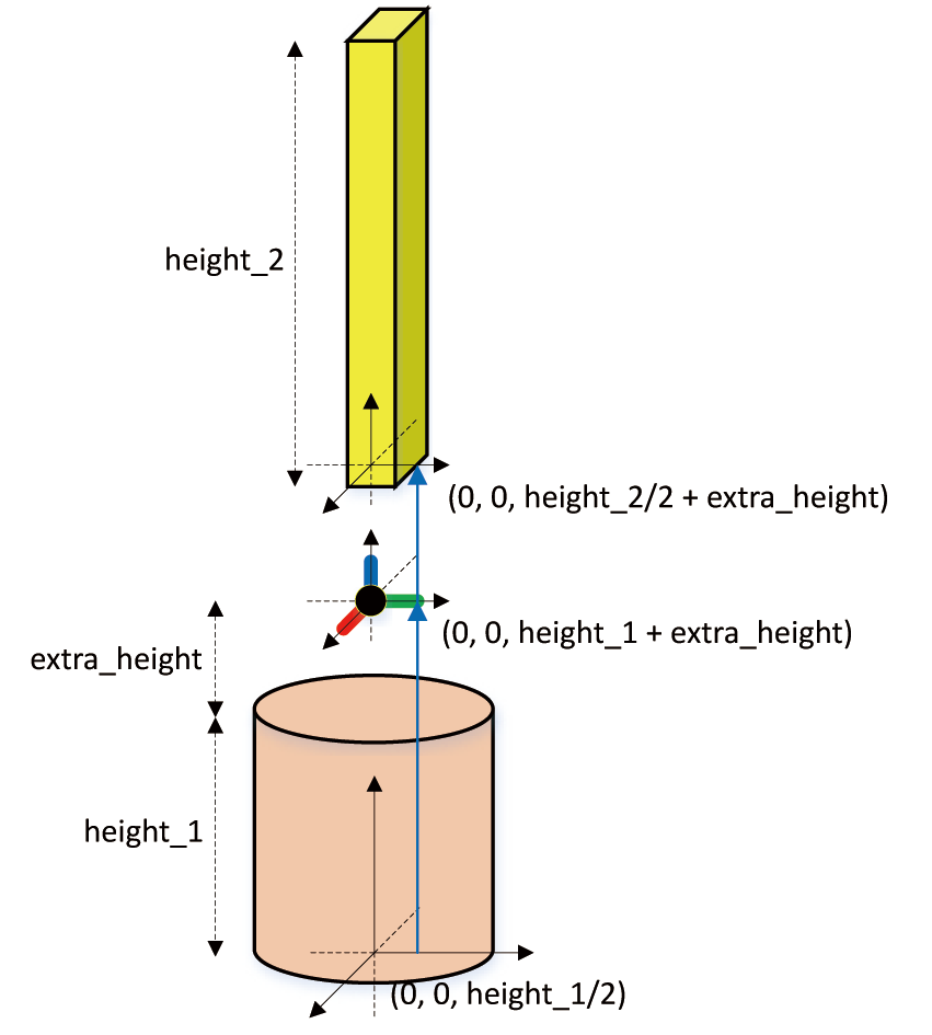 직교 좌표계의 원점은 링크의 중심이 원점입니다. 우리는 링크의 시작점에 원점(0, 0, 0)을 두는 것에 더 익숙 합니다. 아래 그림에서 왼쪽은 URDF에서 원점의 위치이고 오른쪽 그림은 우리가 익숙한 원점을 두기 위해서는 높이에서 (height/2)와 같이 이동을 해야 합니다.