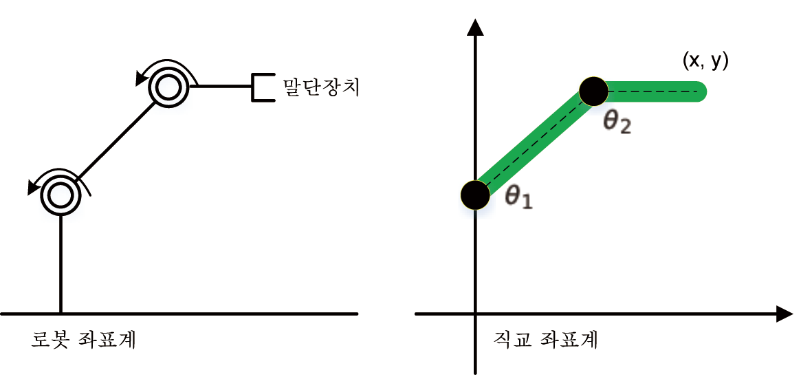 집게가 달린 로봇 팔(manipulator)이 컵을 잡는다고 할 때 말단장치가 컵이 있는 위치까지 이동을 하기 위해서는 직교 좌표계에서 컵의 위치를 먼저 구해야 합니다. 컵의 좌표를 구한 후에는 좌표에 해당 하는 로봇 관절의 각도를 구하여 로봇의 말단 장치를 이동 시킵니다.