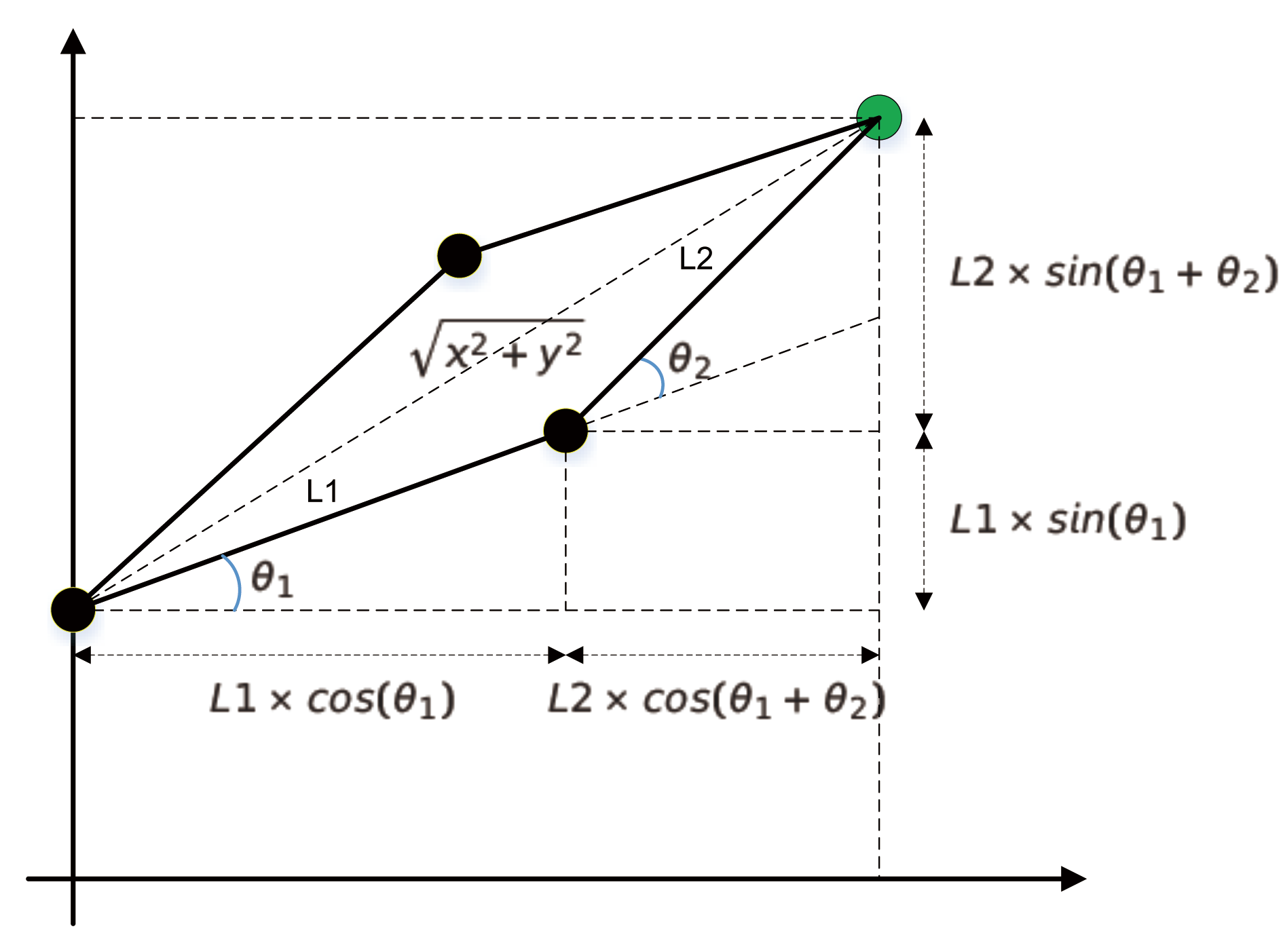 정방향 기구학은 아래 그림과 같이 삼각함수(sin 함수, cos 함수)를 통해서 관절의 각도를 갖고 직교 좌표계의 좌표를 구하는 식입니다. 이는 관절 각도를 갖고는 말단장치의 위치가 어디인지를 알 수 없기 때문에 직교 좌표계에 있는 좌표 값을 통해서 말단장치가 어디에 위치 해 있는지 알 수 있습니다.