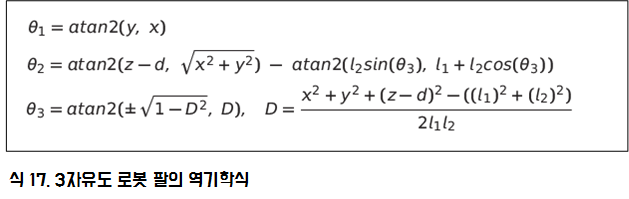 2자유도에서 두 번째 관절의 각도를 위해 x, y에 대해 식을 만든 것과 같이 3자유도의 세 번째 관절의 각도를 위해 p, z에 대해 다음과 같이 식을 만듭니다. (2자유도의 정기구학 식을 참조합니다.)