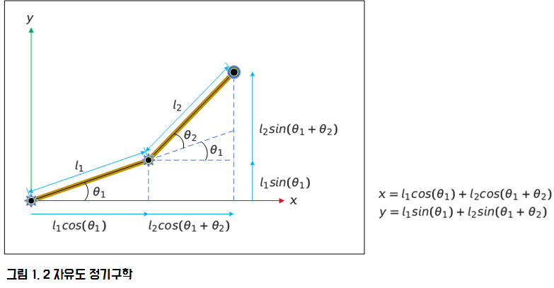2자유도 로봇 팔(SCARA)의 역기구학 식의 유도는 정기구학 식에서 시작을 합니다. 그림 1은 2자유도 로봇 팔의 정기구학 식입니다.
