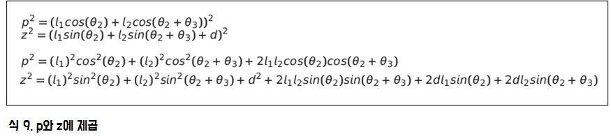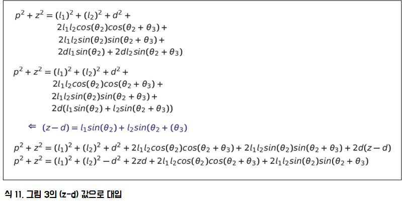 위 식에서 나중에 세 번째 관절 각도만 남기기 위해서 그림 3.에 있는 (z - d)의 값으로 대입을 하여 식을 다시 정리합니다.