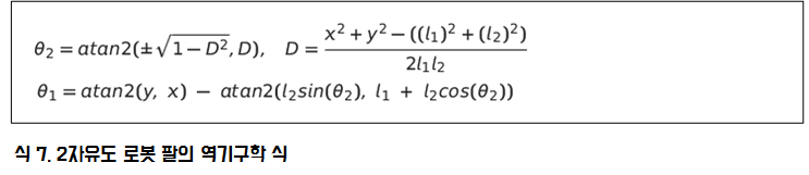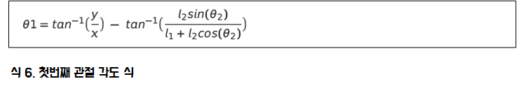 식 5에 구한 두 번째 관절의 각과 위에서 구한 첫 번째 관절을 구하는 식을 정리하면 다음과 같습니다.