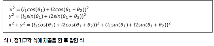 정기구학 식에서 두 번째 관절 각도만 있는 식으로 유도를 하기 위해 x, y에 각각을 제곱을 한 후에 x, y 값을 더한 식을 만듭니다.