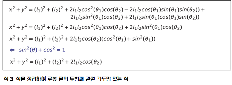 다음은 식을 정리한 후에 sin, cos 제곱공식으로 정리를 하면 두 번째 관절 각도만 있는 식으로 유도가 됩니다.
