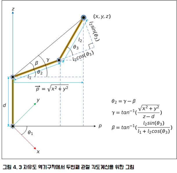 세번째 관절 각도로 유도한 식에 벡터 p는 그림 3에 있는 x, y 값으로 대입을 하여 완전한 세번째 관절 각도와 변수 x, y, z로 구성된 식이 유도됩니다. (d, l1, l2는 로봇 몸체의 길이로써 상수입니다.)