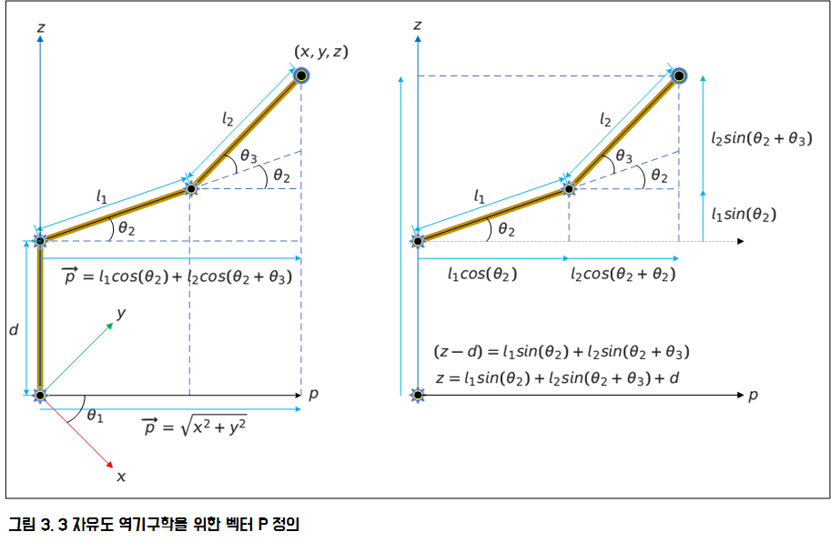 3자유도 역기구학 식은 2자유도 역기구학 식을 유도하는 방법과 같은 원리입니다. 2자유도에서 유도하는 것과 같게 하기 위해 가상으로 벡터 p를 그리면 벡터 p와 두번째 관절과 세 번째 관절은 2자유도와 같게 됩니다.